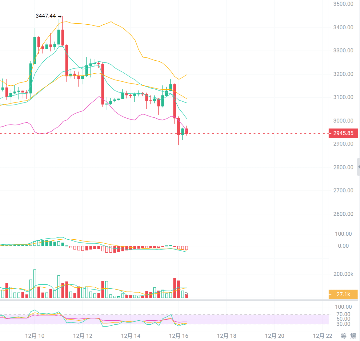以太坊走勢與比特幣相近,日線圖價格跌破中軌靠近下軌,四小時圖均線空頭排列、布林帶朝下開口,空頭強勢。短期小時圖放量結束,RSI從超賣區拐頭向上,價格有反彈需求。日內短期阻力3000和3150,短期支撐2900和2830。