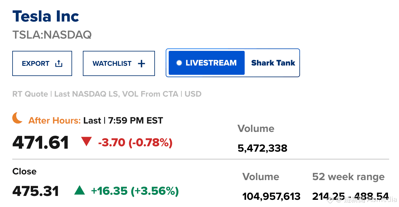 特斯拉 (Tesla) 股價週一強勢大漲 3.56%,一度逼近歷史高點,收在 475.31 美元。儘管市場對其估值過高、基本面轉弱的質疑聲不斷,但投資人似乎仍選擇押注執行長馬斯克描繪的 AI 與自動化藍圖,帶動股價強勢反彈。
