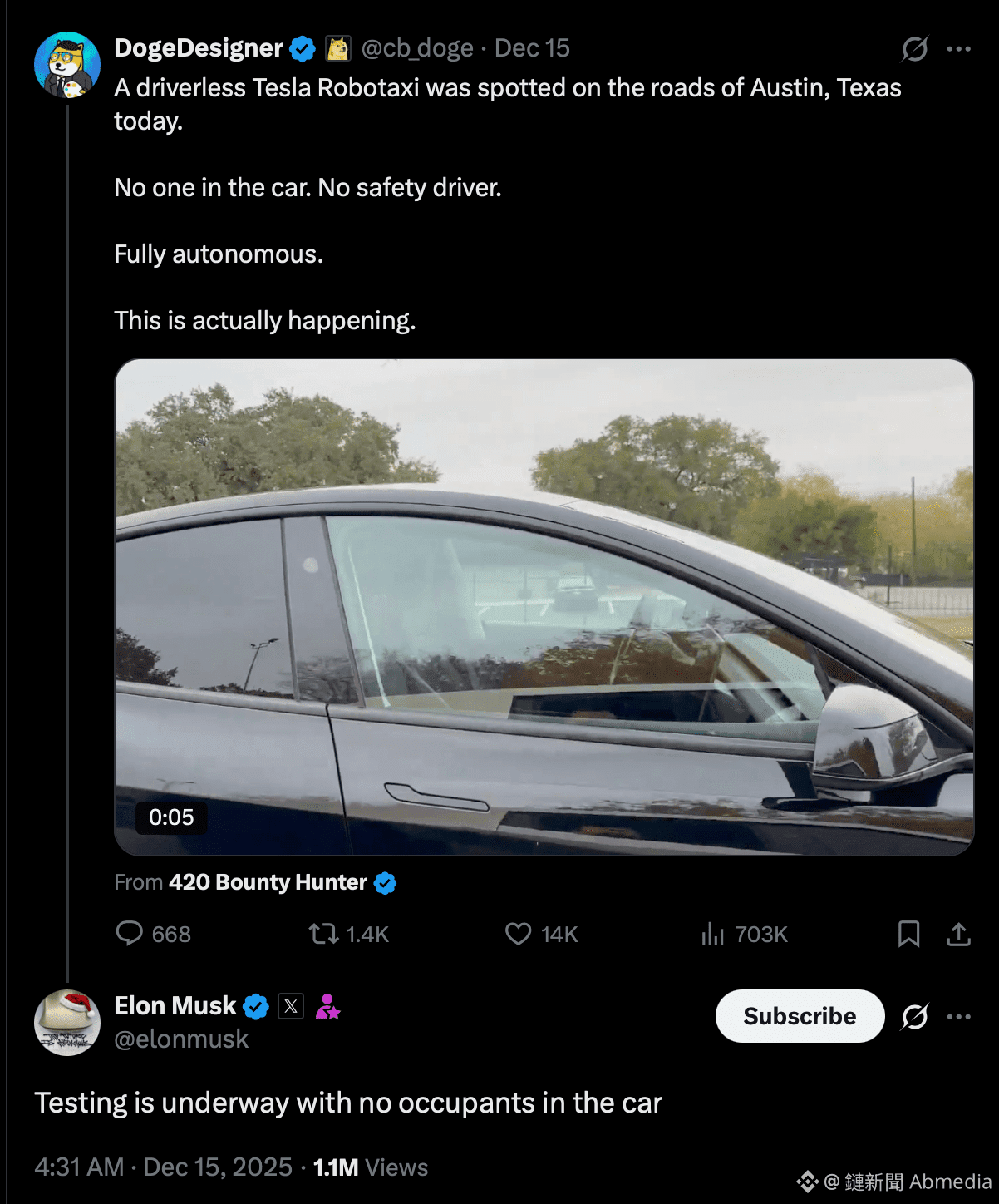 今年 6 月,特斯拉已在德州奧斯汀推出配有安全駕駛員的有限度 Robotaxi 服務。執行長馬斯克近日於社群平台 X 表示,相關測試目前已進入「無人乘坐」階段,引發市場關注,此消息也激勵特斯拉股價週一上漲 3.56%。