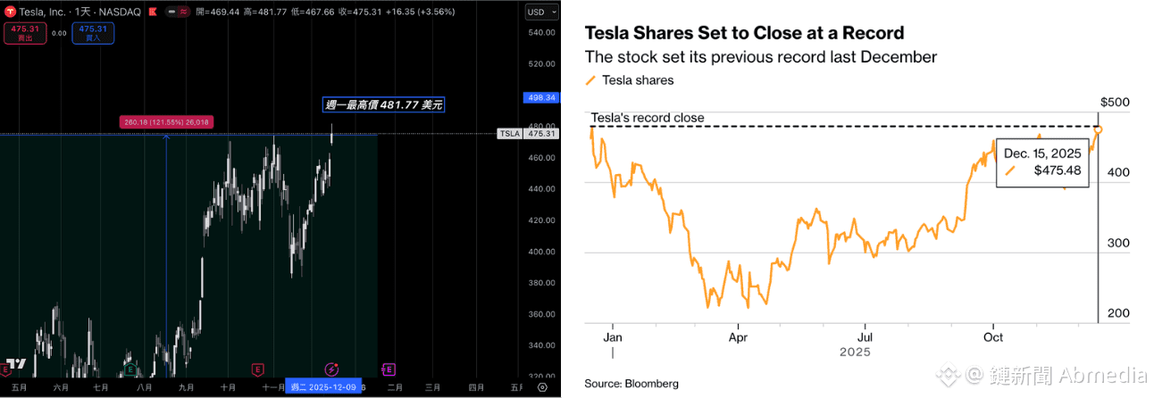 特斯拉股價週一延續漲勢,最高價一度來到 481.77 美元,並逼近去年 12 月創下的高點 488.54 美元。這波走勢,也讓特斯拉在市場質疑聲中,再度成為焦點。