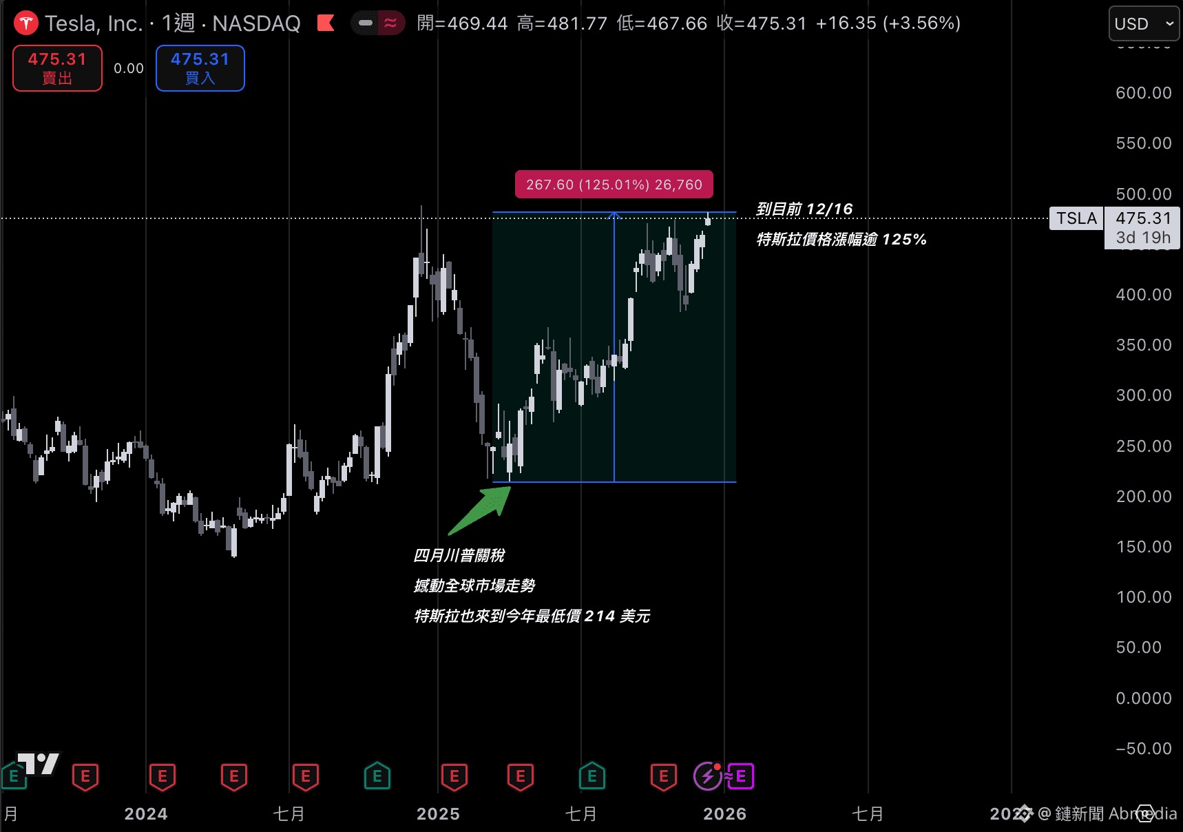 回顧今年股價表現,特斯拉曾在 4 月初觸及波段低點,當時正值全球金融市場因美國總統川普發動關稅攻勢而出現劇烈動盪。自該低點以來,特斯拉股價已大幅反彈,漲幅超過 125%,完成一波快速且幅度可觀的回升。