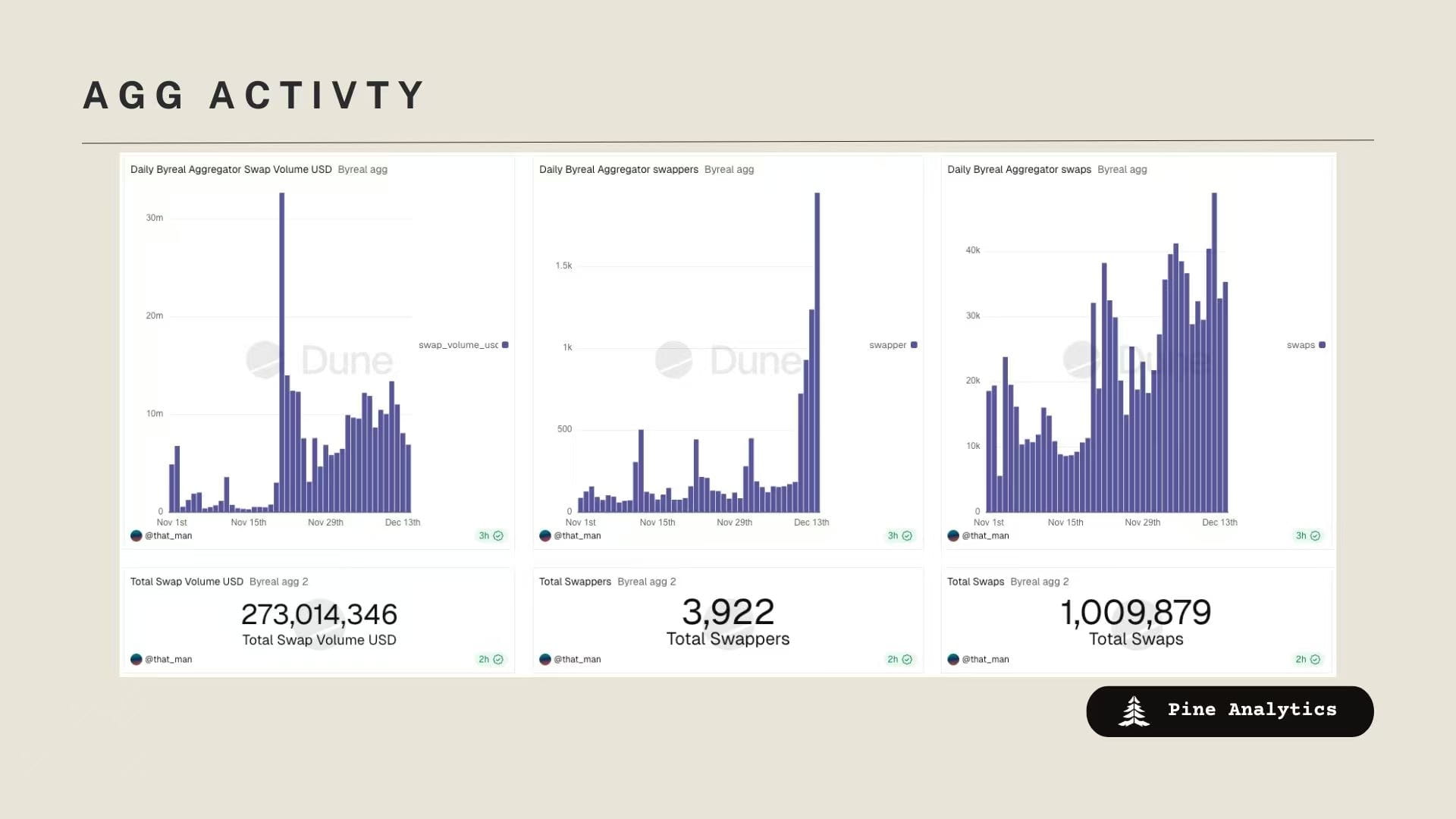 同時據 Dune 顯示, Byreal 現每日有超 1000 個活躍錢包,交易量最大交易對分別爲 PYBOBO-USDC、USDT-xAUt0、TSLAx-USDC 和 MON-USDC。