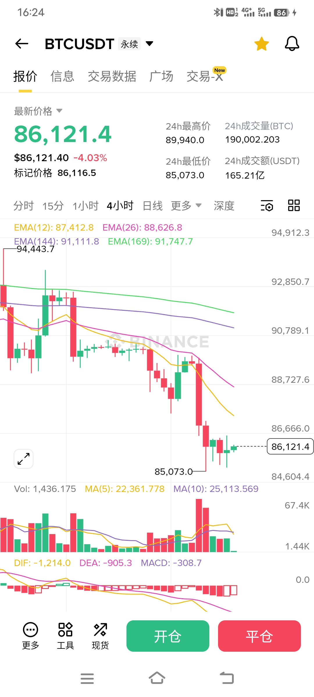 $BTC 當前價格 $86,126.5,已有效跌破此前強調的 $90,000 - $88,800核心支撐區間。此次下跌確認了短期多頭結構的失效,市場正從單邊上漲預期轉入一個複雜的震盪整固階段。