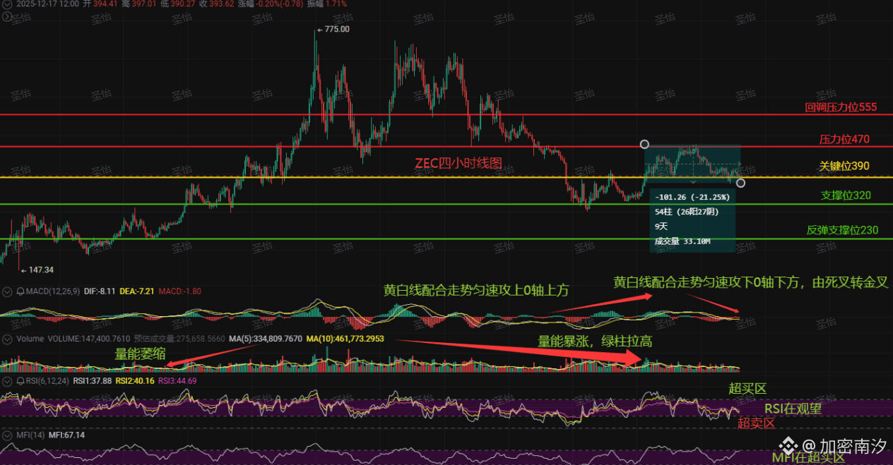 注意了,ZEC这走势有点意思。四小时图上,MACD黄白线正“匀速攻下0轴下方”,但注意了——它正在从死叉往金叉转。这通常是个矛盾信号:一边是趋势向下,一边是短期可能反弹。现在价格在390-470这个区间震荡,整体还是个下跌趋势。那问题来了:你是该冲进去“吃反弹”,还是该继续看空?