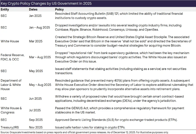 美國在2025年通過關鍵立法與政策調整,爲加密資產納入主流金融體系掃清部分障礙。2026年,市場結構立法的最終落地將成爲行業發展的決定性一步。