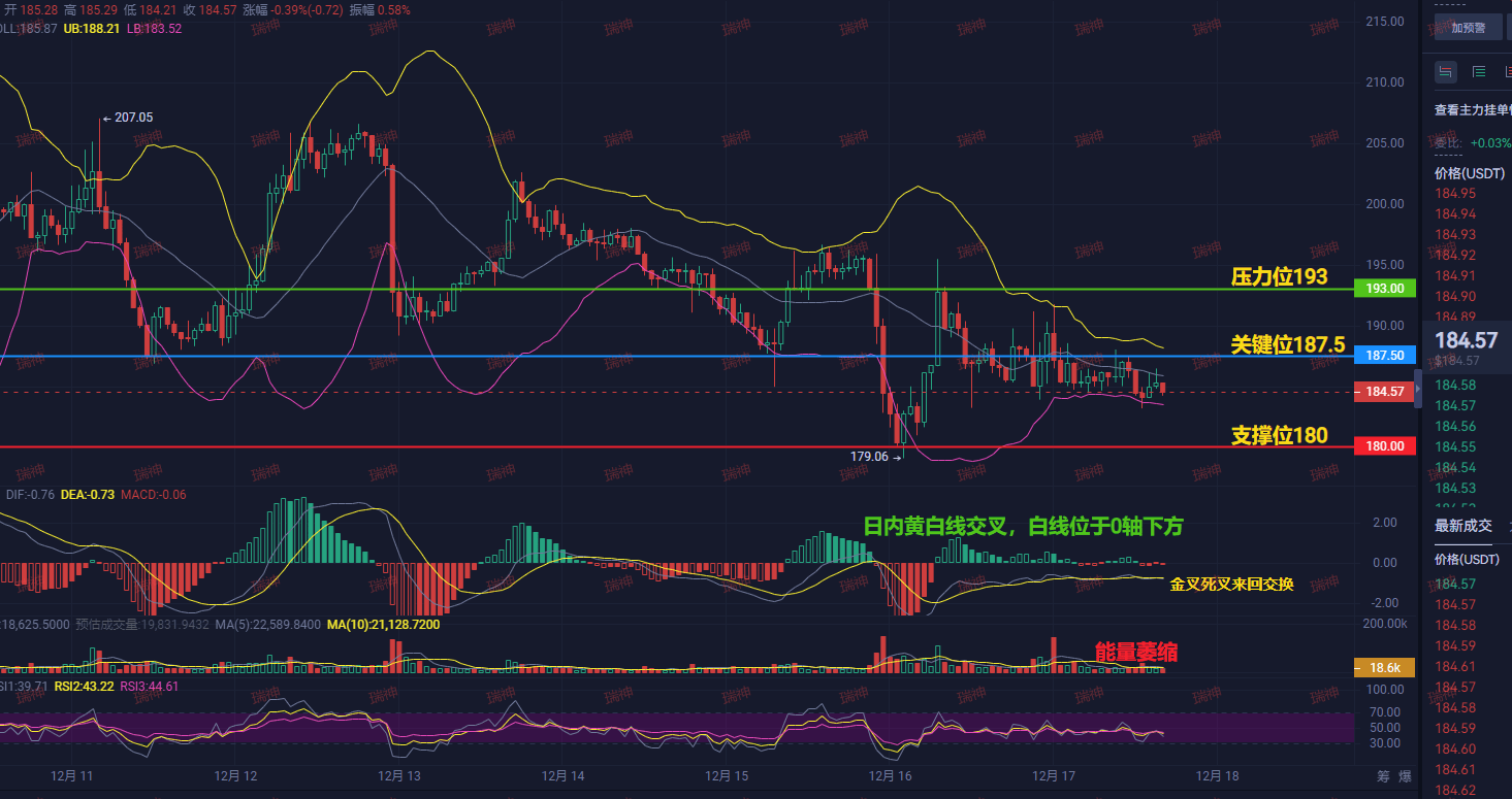 價格被卡在180支撐和187.5關鍵位之間窄幅震盪,像被壓緊的彈簧。
