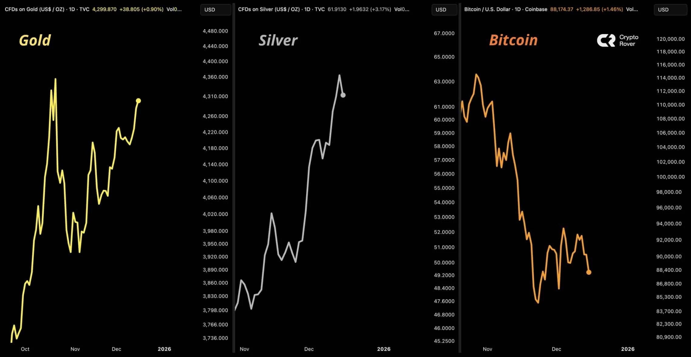 鏈上黃金交易活躍,價格堅挺,比特幣短期承壓,比特幣與黃金比率下降50%說明避險資產定義正在變化。