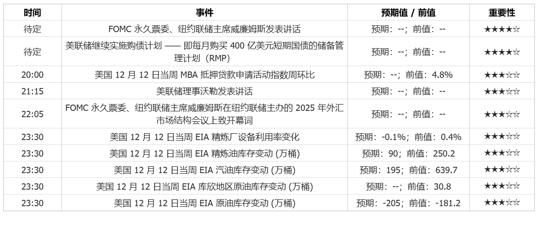 美聯儲——貝森特:猜測美聯儲主席人選將於1月初公佈。美媒:沃勒將於週三接受特朗普的面試。報道發出後,預測市場認爲沃勒出任美聯儲主席候選人的概率限制擡升至15%。博斯蒂克(臨近退休):本希望在12月維持利率不變,未在明年預測中納入任何降息。