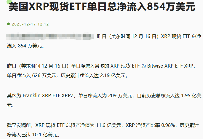 每天有850萬美金真金白銀通過ETF買入XRP,累計淨流入已超10億美金——這確實是長期利好,說明機構認可XRP的現貨價值。但注意兩個細節:一是淨資產比率僅0.98%,在ETF家族裏還是“小弟”;二是這種機構慢錢,往往抵不住散戶和槓桿資金的短期踩踏。簡單說:ETF託底,但不一定能立刻拉昇。