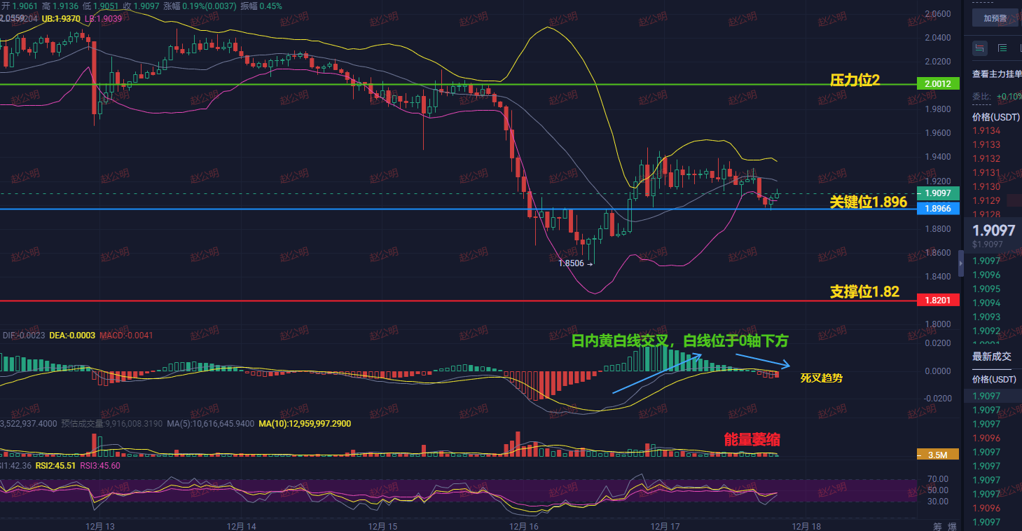 關鍵位置:2.0是鐵頂,1.896是當前生死線。現在價格1.9124,就在生死線邊上晃悠。往下1.82支撐看似不遠,但一旦跌破,空間不小。