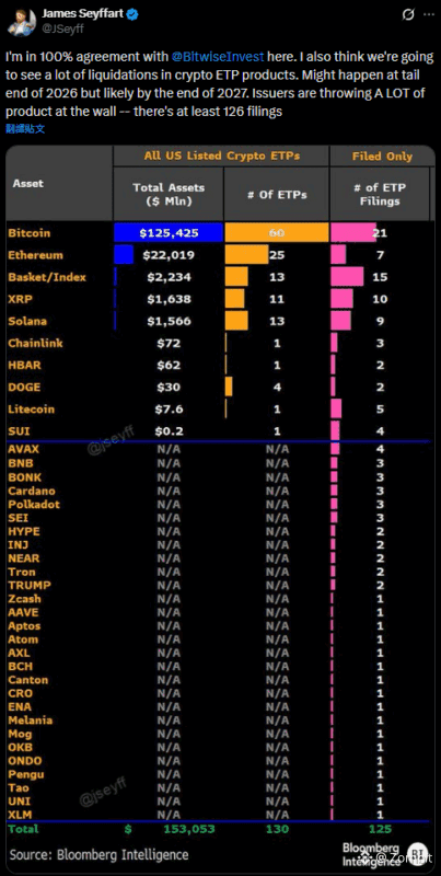Seyffart 寫道:「我還認為加密貨幣 ETP 產品將出現大量清算,可能發生在 2026 年底,但更有可能在 2027 年底之前。發行商正把『大量』產品推向市場——目前至少還有 126 件申請案。」