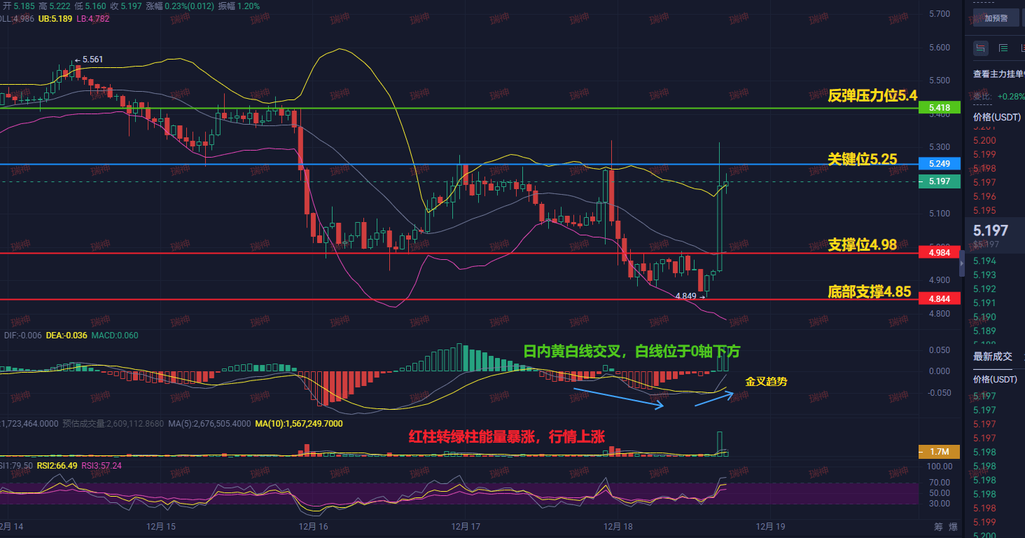 價格正在測試5.25關鍵位,如果能站穩,下一個目標就是5.4壓力位。