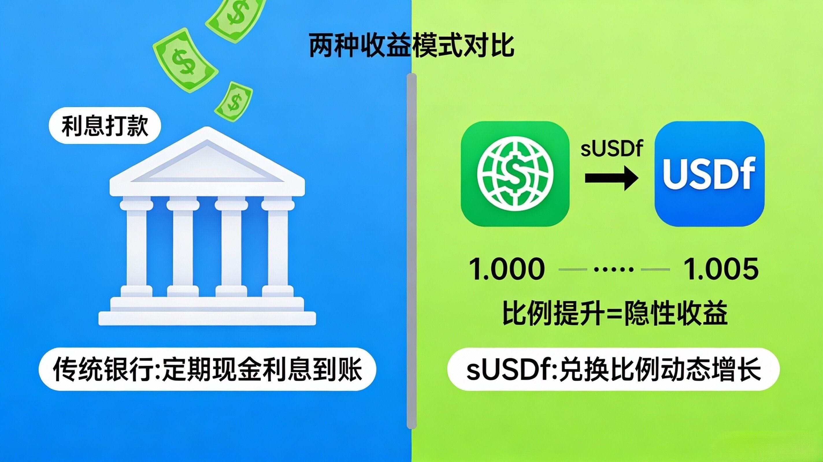 阿祖見過太多第一次用 USDf 的人,質押完換到 sUSDf 之後,隔幾個小時就開始焦慮:怎麼賬戶裏沒有“利息入賬”?APY 明明掛在那兒,爲啥我看不到錢變多?這類焦慮本質上不是你太敏感,而是你把 sUSDf 當成了“銀行存款”,期待它像傳統理財一樣給你打款。但 sUSDf 的邏輯更像“份額制”:收益不會用一筆筆轉賬的方式出現,而是體現在 sUSDf 兌換回 USDf 的換算率裏,你拿着同樣數量的 sUSDf,能換到的 USDf 會隨着時間慢慢變多,這纔是你真正收到的收益。