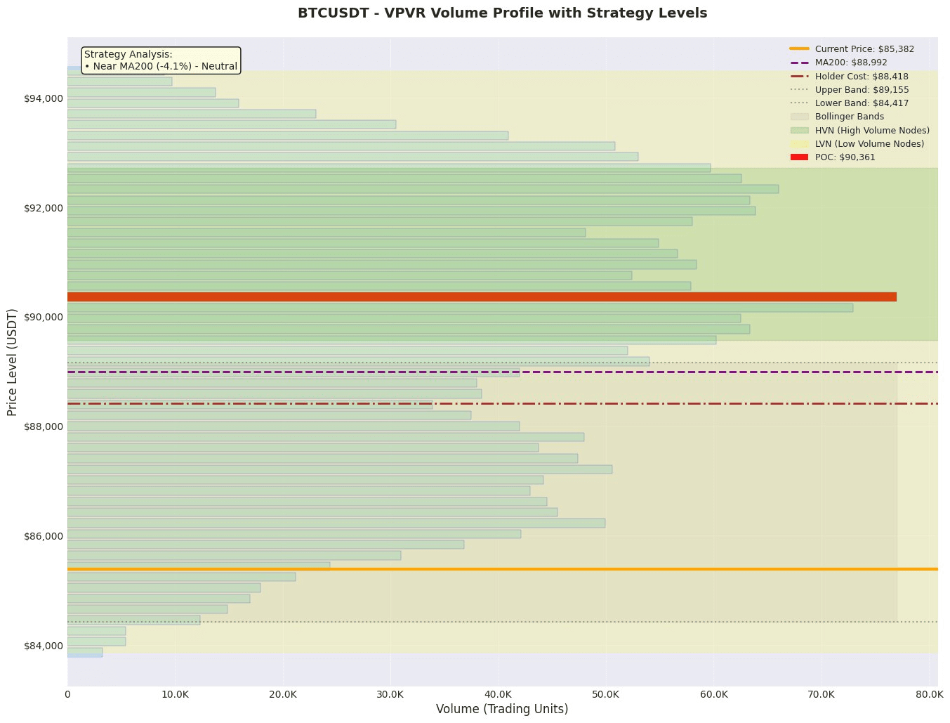1. 價值錨定區:根據VPVR數據,當前市場的價值錨定區(Value Area)位於86226.7058625至93117.0919875之間,POC(最大成交量價)爲90360.9375375。當前價格85381.89位於該價值區下沿VAL之下,表明市場已進入短期超賣區域。POC(90360)與MA200(88992)共同構成了上方核心阻力區,價格反彈至此將面臨強大拋壓。