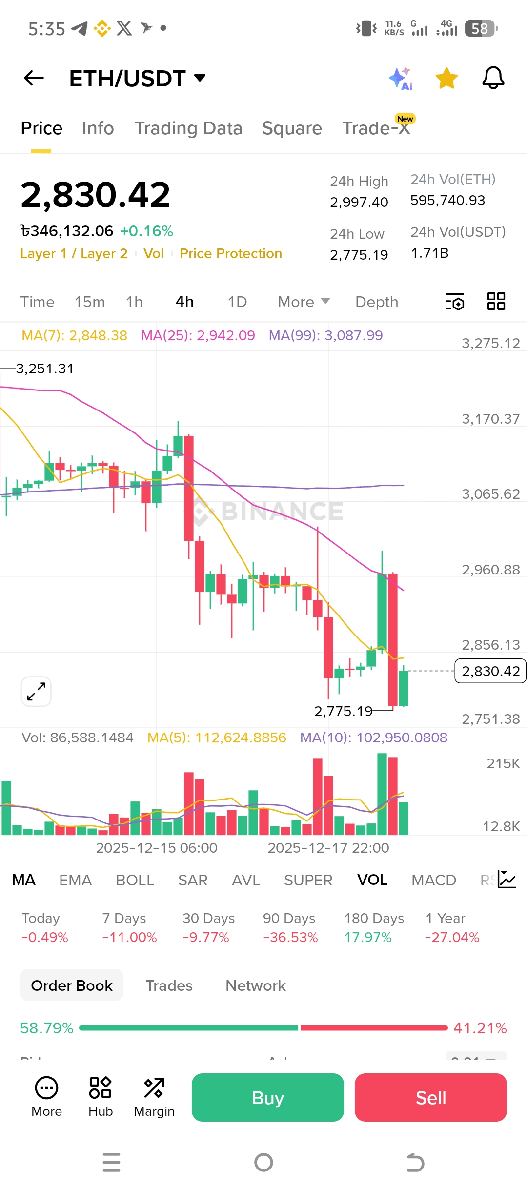 現在,ETH 的交易價格約爲 $2,830-$2,850,今天在高交易量下小幅上漲。我們看到它最近跌至約 $2,775 的低點,突破了一些短期移動平均線,但從該區域反彈的過程中伴隨著增加的綠色交易量——這暗示著賣壓可能正在減弱,累積可能已經開始。從長期來看,以太坊在過去 180 天中仍然穩定上漲,提醒我們網絡的基本強度。