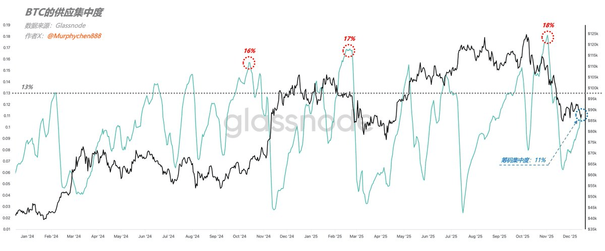比如,我在9月30日的推文中提醒籌碼集中度已升至15%,不久後,BTC迎來一波突破歷史前高的強勁反彈。在11月1日集中度更是創紀錄的升至17.6%(見引文),此後BTC一路從11w美元跌至8.5w美元。