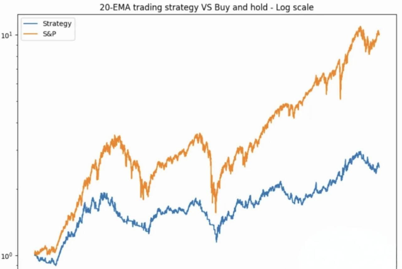 20EMA交易策略通過該指標生成買賣信號,核心邏輯爲:價格上穿20EMA→買入;價格跌破20EMA→賣出,旨在捕捉短期市場波動。對標普500 ETF(SPY)的回測顯示,策略年化複合收益率3.06%(低於買入持有7.87%),持倉時間67%,最大回撤42.65%(優於買入持有56.47%),單獨使用效果有限。加入輔助技術指標後,策略年化複合收益率提升至5.03%,最大回撤持平,表現顯著優化。此外,回測證實該策略在比特幣等加密貨幣市場的表現優於股票市場。