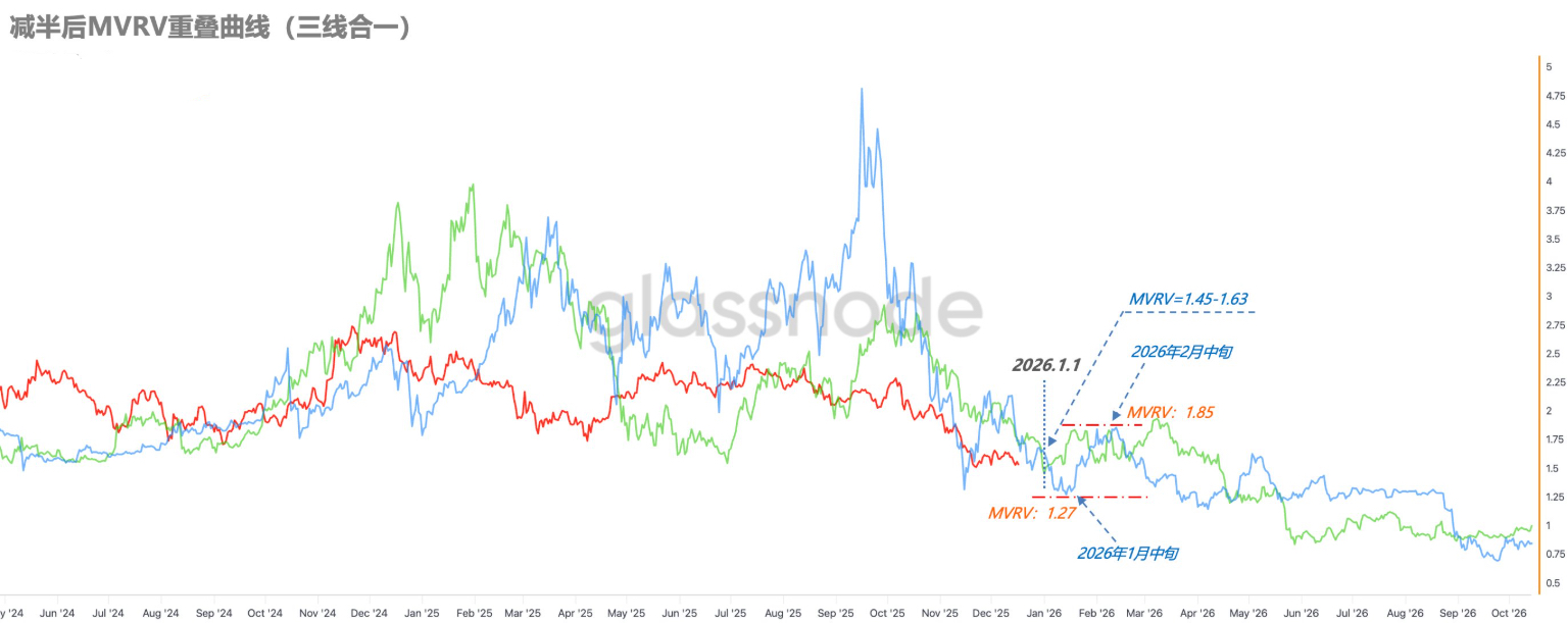 我想,小夥伴們應該更關心在12月26日行權日之後,即2026年1季度BTC的走勢。從玄學指標上看,1月中旬有一個低谷,2月中旬有一個峯值。1月中旬MVRV最低值爲1.27,對應BTC價格是 $71,000 左右。