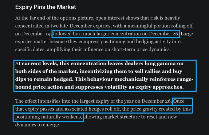 2、當前期權市場的結構,使得做市商在BTC現貨價格的兩端都持有long gamma,爲了平衡gamma風險暴露,在機制上會促使他們逢高賣出、逢低買入以保持對衝。這種行爲會機械地強化BTC價格在區間內震盪,並在臨近行權日時,抑制波動性。