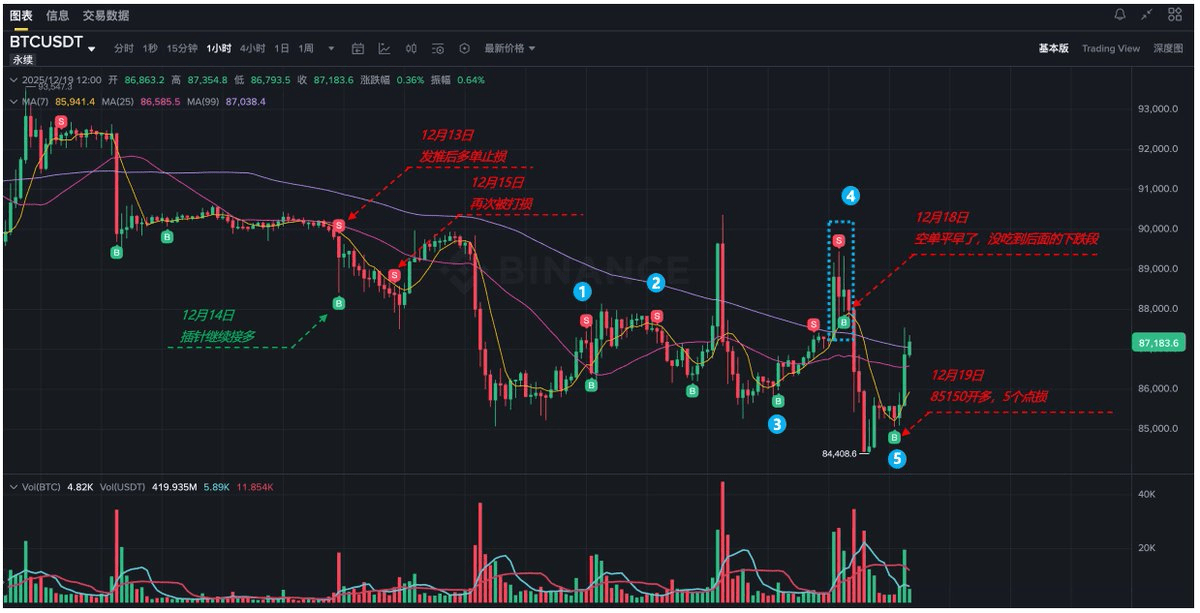 其實只要在盯盤1個小時,等到24點的k線出來,指標重新恢復偏離修復我應該不會平空,也就可以喫到後面跌至8.5w的這段利潤。早上起來正好無縫銜接超賣信號,反手開多。
