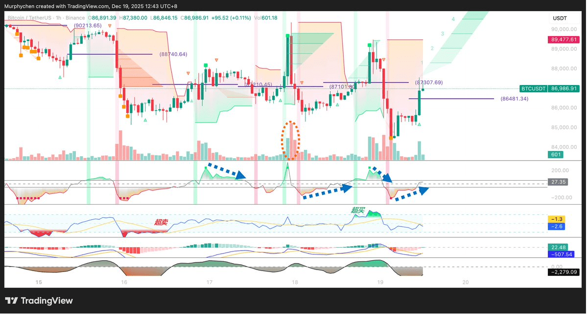 其中比較可惜的是昨天(18日)晚上22點開在89,166的空單,當時看到超賣信號和趨勢偏離修復。但是在23點的那根K向上插針,把指標的背離打破了,我擔心後半夜繼續拉盤被打損就平了空,基本是平進平出。