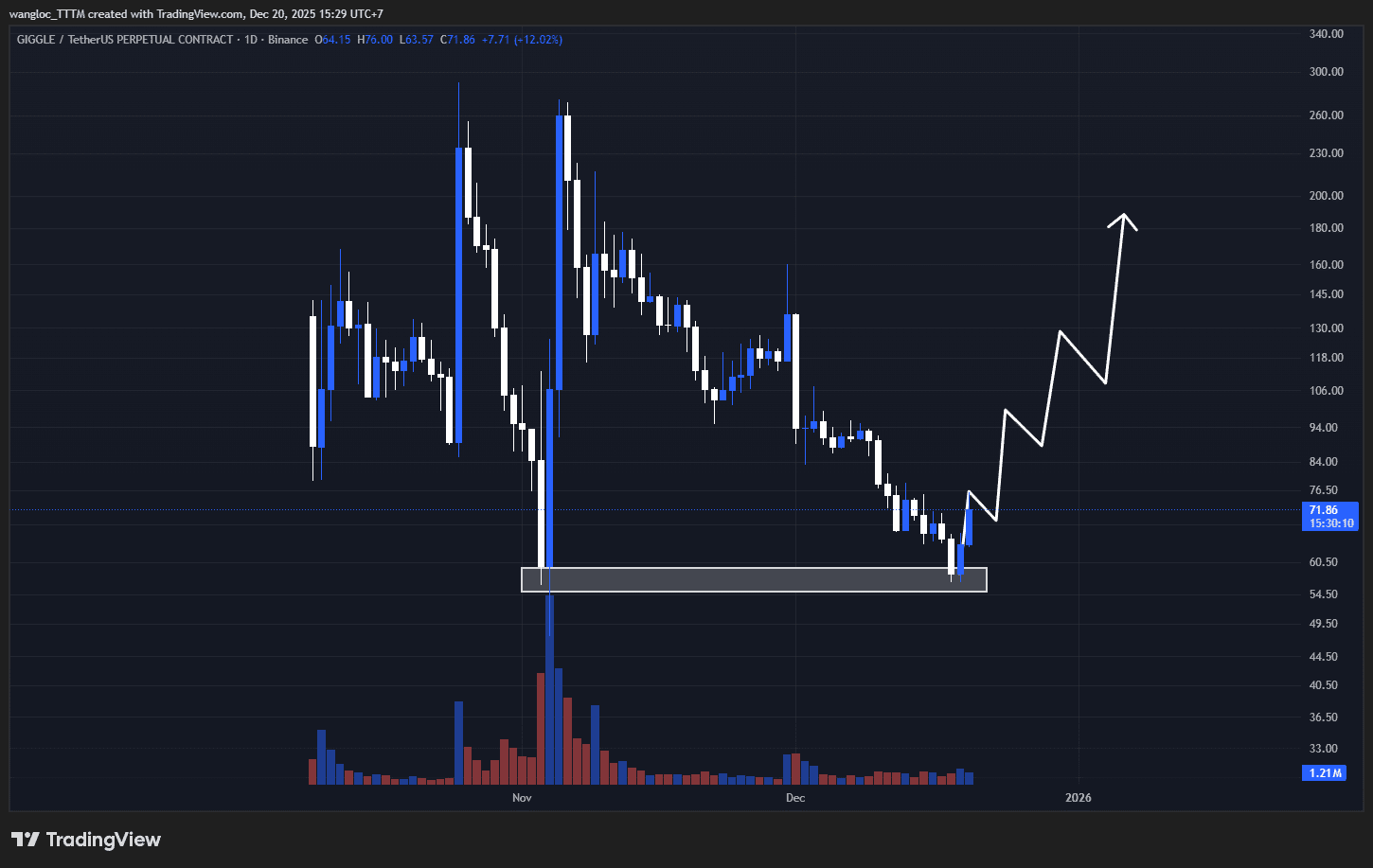 $GIGGLE 剛剛從56區域打印出一個非常激進的衝動,直衝76,隨後出現急劇拒絕。在如此接近垂直的移動後,價格很少會立即繼續。通常在高點下方冷卻和整合有利於短期回調以重新平衡流動性。