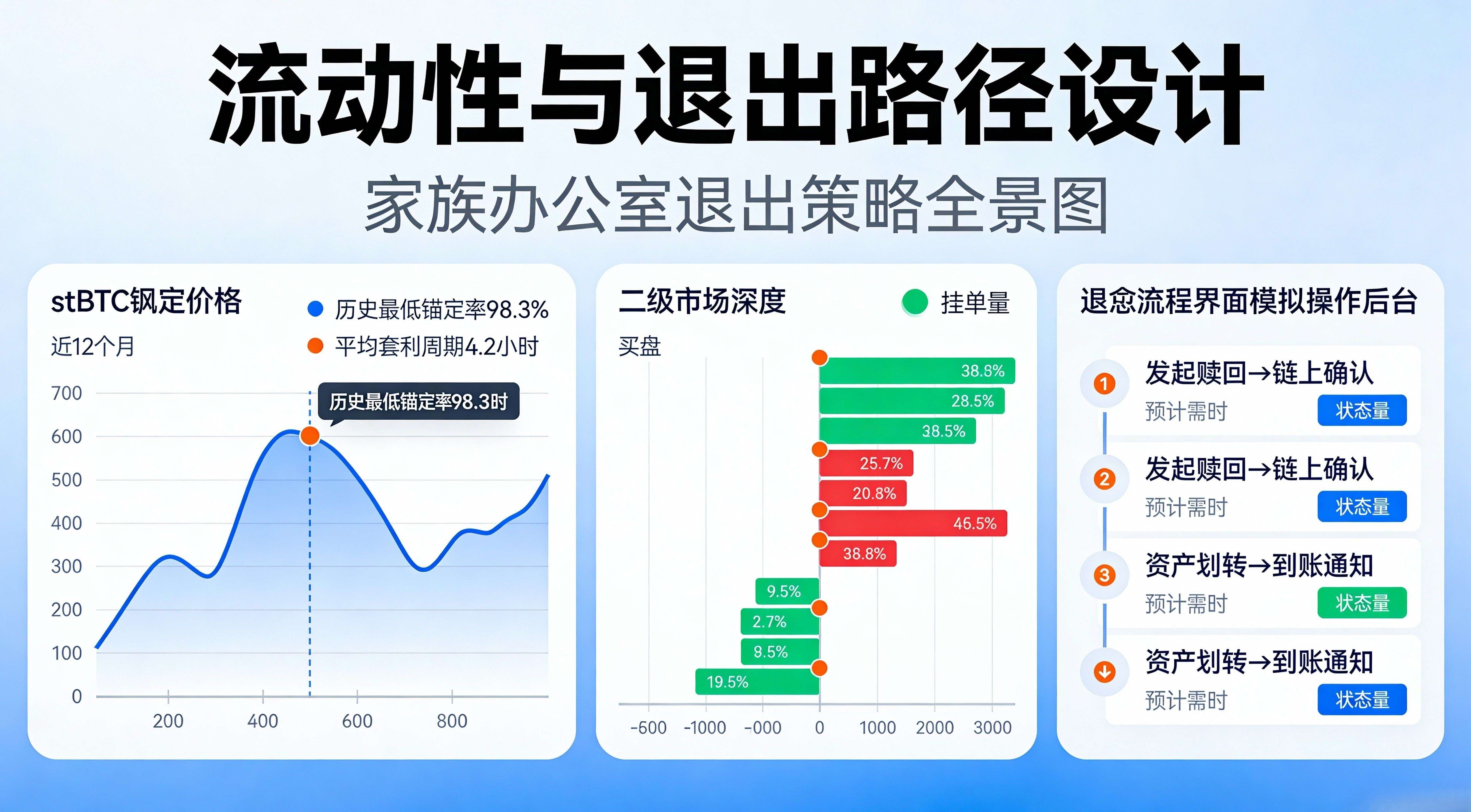 最後是流動性與退出體驗,這一項會直接決定“能佔幾分”。家族辦公室通常不追求把全部 BTC 都拿去上收益,他們更在意“在需要現金、需要調倉、需要應對黑天鵝時,我能不能體面撤退”。這就要求你不僅看 TVL 和 APY,還要看 stBTC 是否長期貼近錨定、二級市場深度如何、贖回是否有等待期、費用結構是否會在極端時期放大。換句話說,機構要的不是一個漂亮的年化數字,而是一個“淨收益可實現、退出路徑可執行”的配置品。