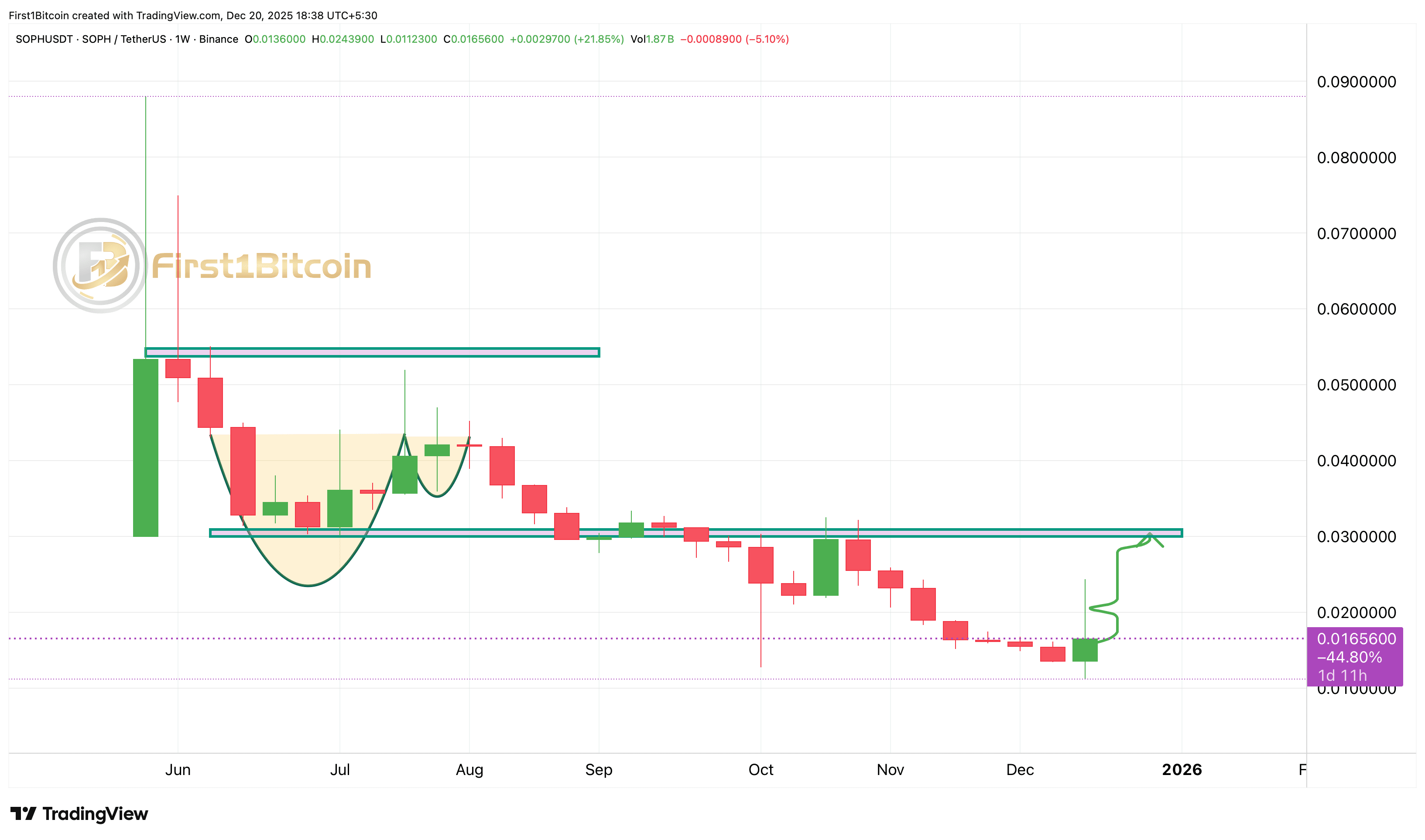SOPH正試圖從$0.015–$0.018的需求區反彈,經歷了長時間的下跌趨勢。