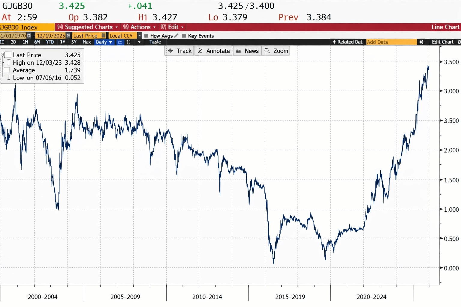 日本的30年期債券收益率剛剛達到3.42%,是歷史上最高水平。