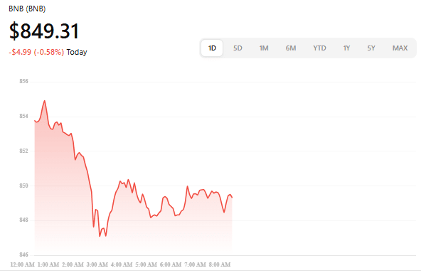 近期價格走勢:BNB在最近的交易中出現小幅回調和賣壓,交易價格低於850美元的關鍵水平。TechStock²+1