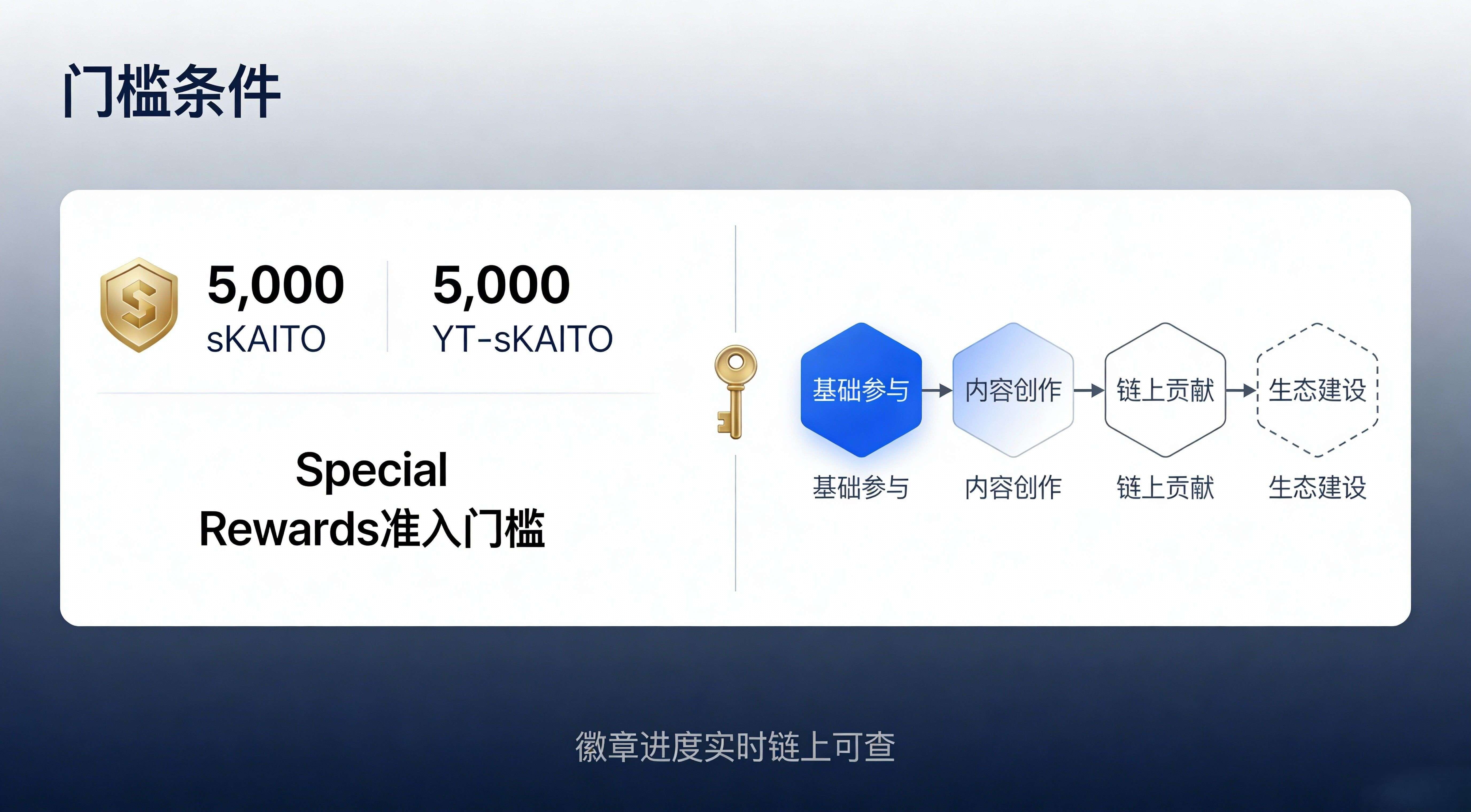 然後是很多人更容易踩坑的“Special Rewards”。它不是“我也發發帖就能沾邊”的那種獎勵,而是有明確門檻與分段解鎖結構:文檔寫的是 0.3% 的 FF 代幣供應量作爲 special rewards,總體面向 Top 200(以及滿足條件的 Kaito 質押相關錢包),並且還要求在活動期間持有至少 5,000 的 sKAITO 或 YT-sKAITO;更細的是,它採用按徽章分階段解鎖的機制,你不是“進了池子就拿滿”,而是解鎖比例跟你的徽章完成度掛鉤,未領取的部分在規則裏也寫了後續再分配方式。 所以阿祖會把這部分理解成“長期玩家獎勵”,不是給衝刺黨、也不是給搬運黨準備的。