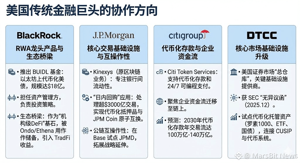 在美国传统金融巨头的协作蓝图中,各机构的深化布局体现了更为具体的战略侧重与技术细节。贝莱德为首个在公链(以太坊)上发行的代币化美国国债基金,这奠定了其作为资产管理方将传统金融收益引入公链生态的基石地位。