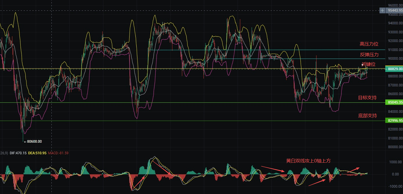 梅姐個人看法:雖然MACD顯示有上攻動力,但消息面偏空,加上BTC這幾天整體是橫盤震盪,我覺得直接衝上91000難度很大。