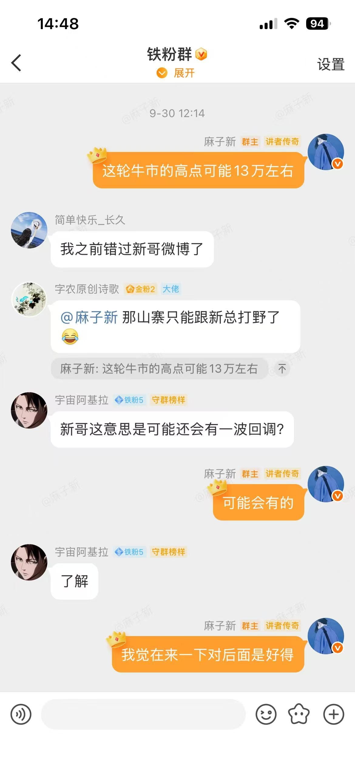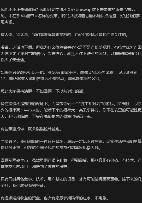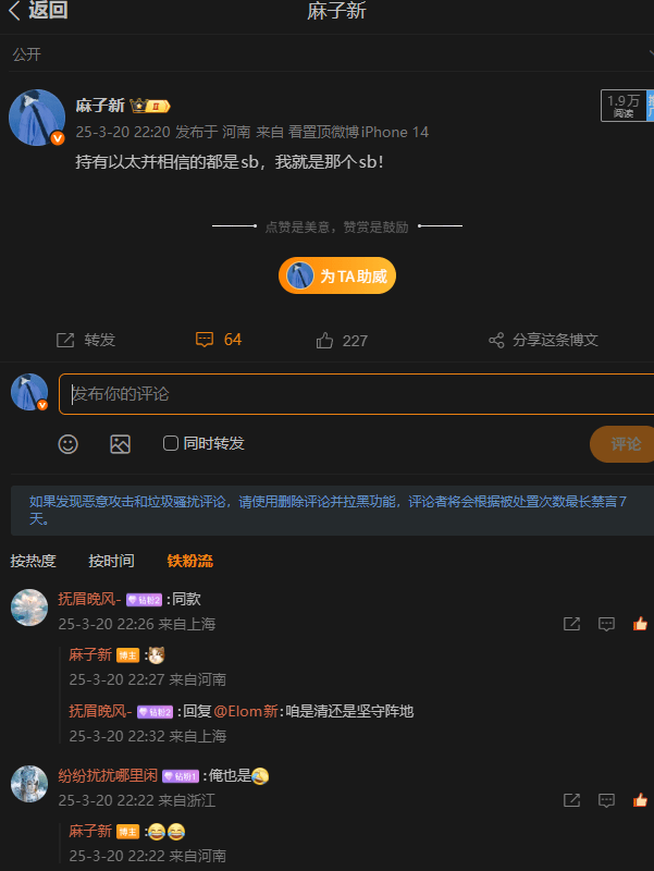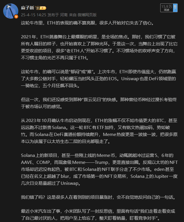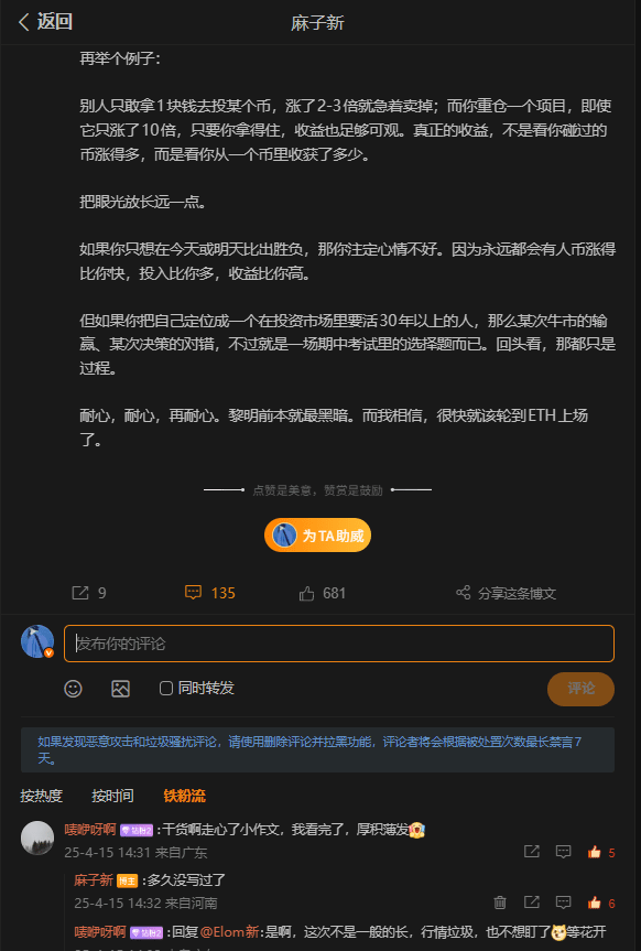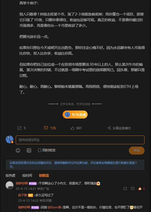 後面也不能擋着我繼續強調可以加倉,最後應該是4月中了,我寫了一篇類似小作文的帖子,從很多角度去講e子,最後以及重倉才能拿住,重倉才能喫,包括結尾的一些e的黑暗已經過去也,黎明已經來了。因爲當時價格都1400了,一些黑子和特舔我鐵粉發言都是不友好了,這時候應該有兄弟問了,你爲什麼不拉黑讓他們一直噴你?