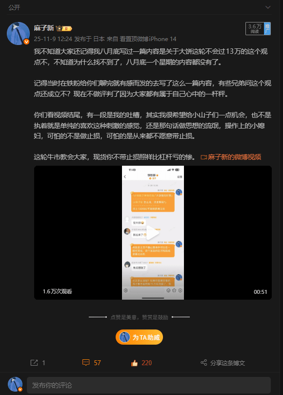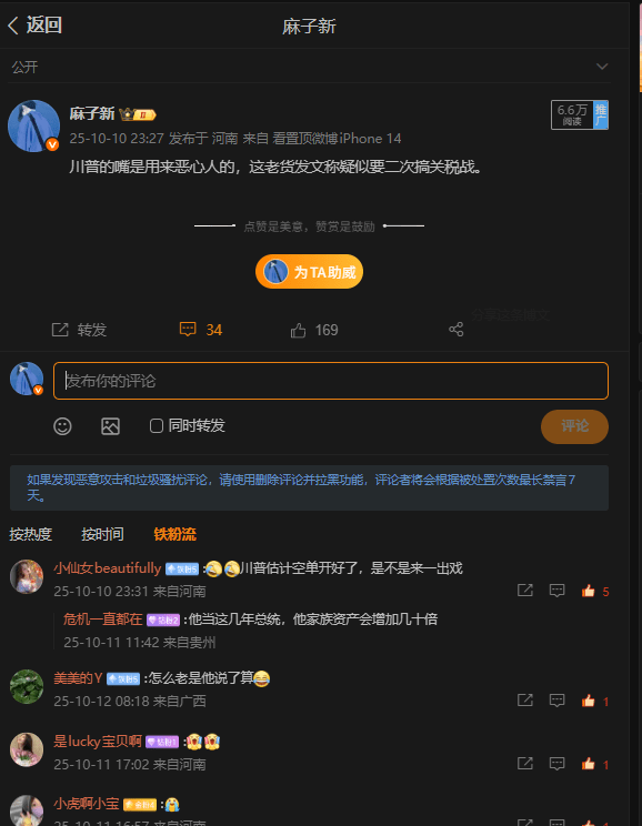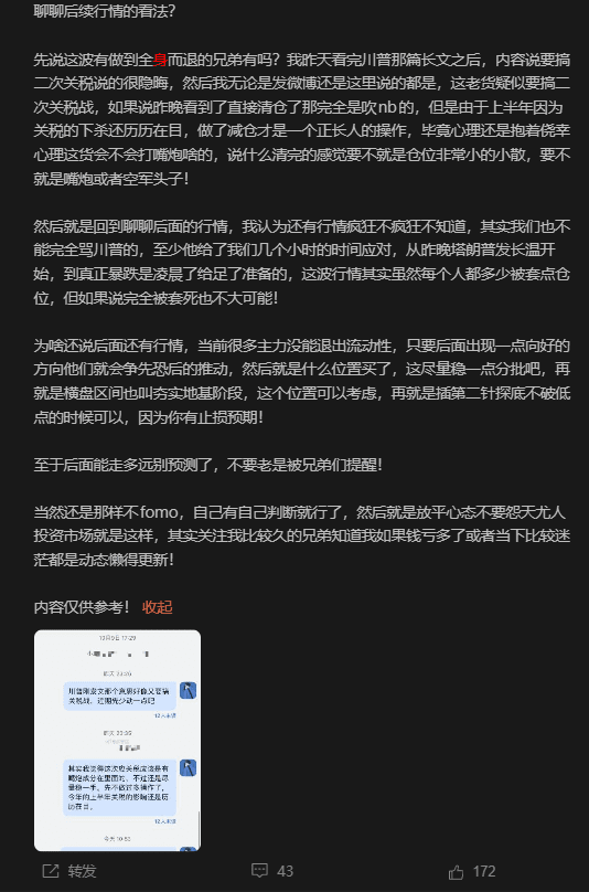 但是判斷對和完全作對又是兩碼事,不管是微博和是小太陽吧,都說大餅那會在派發階段,但是我卻沒有清倉也只是做了部分減倉,後面還買了點山寨,是賺了的,但是擋不住1011啊,這個虧錢屬實是該的,因爲10.10晚上川普的長文剛發出來,我就去看了,然後第一是時間發了微博和小太陽,川普又要搞關稅戰了,最近穩點吧畢竟上半年的經歷還都是歷歷在目的。