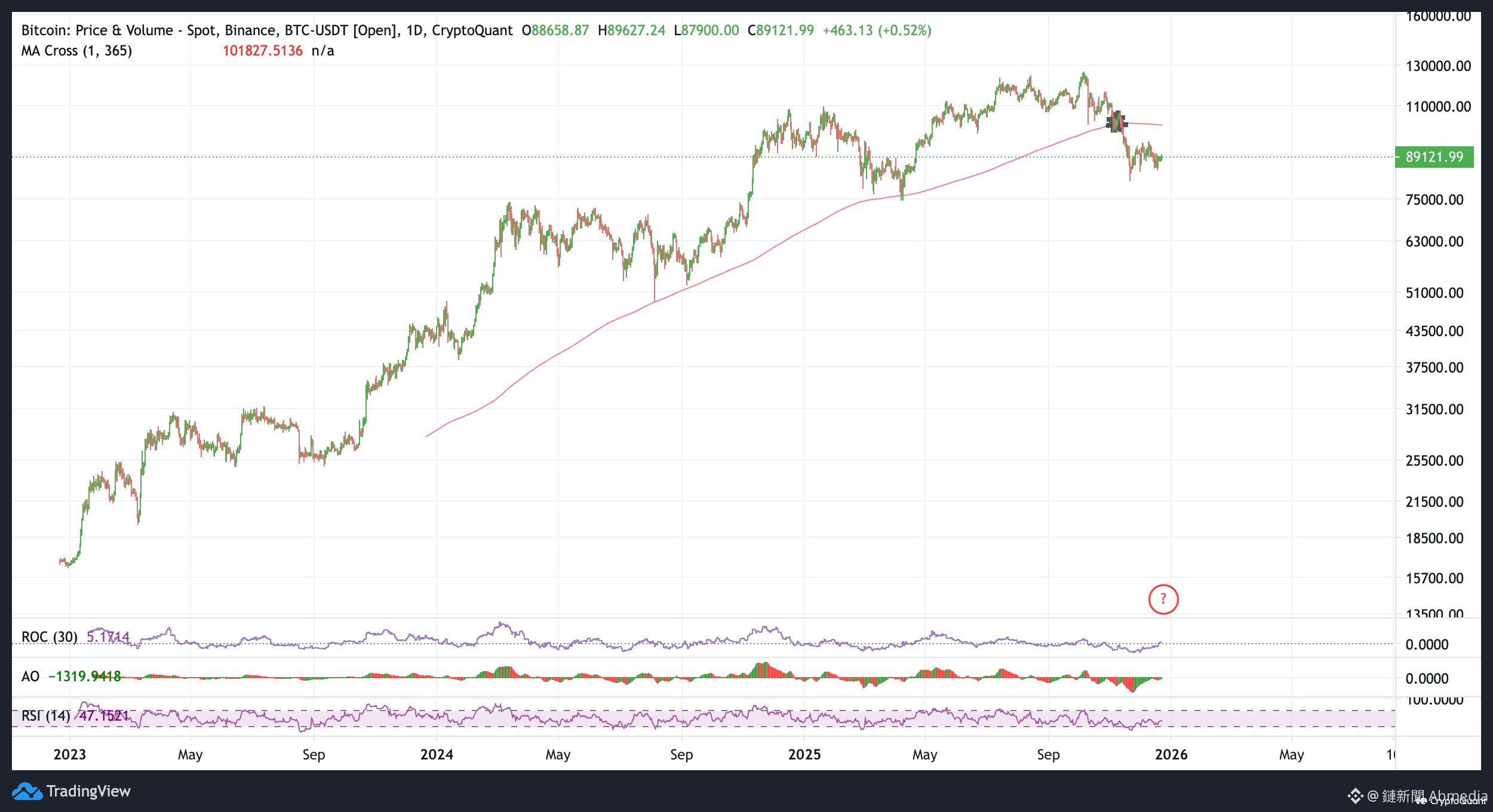 比特幣近期回落至 88,000 美元附近,較 10 月的歷史高點下跌 30%,象徵著 365 日移動平均線的跌破,CryptoQuant 認為這是過去各週期中最可靠的「牛熊分界線」。