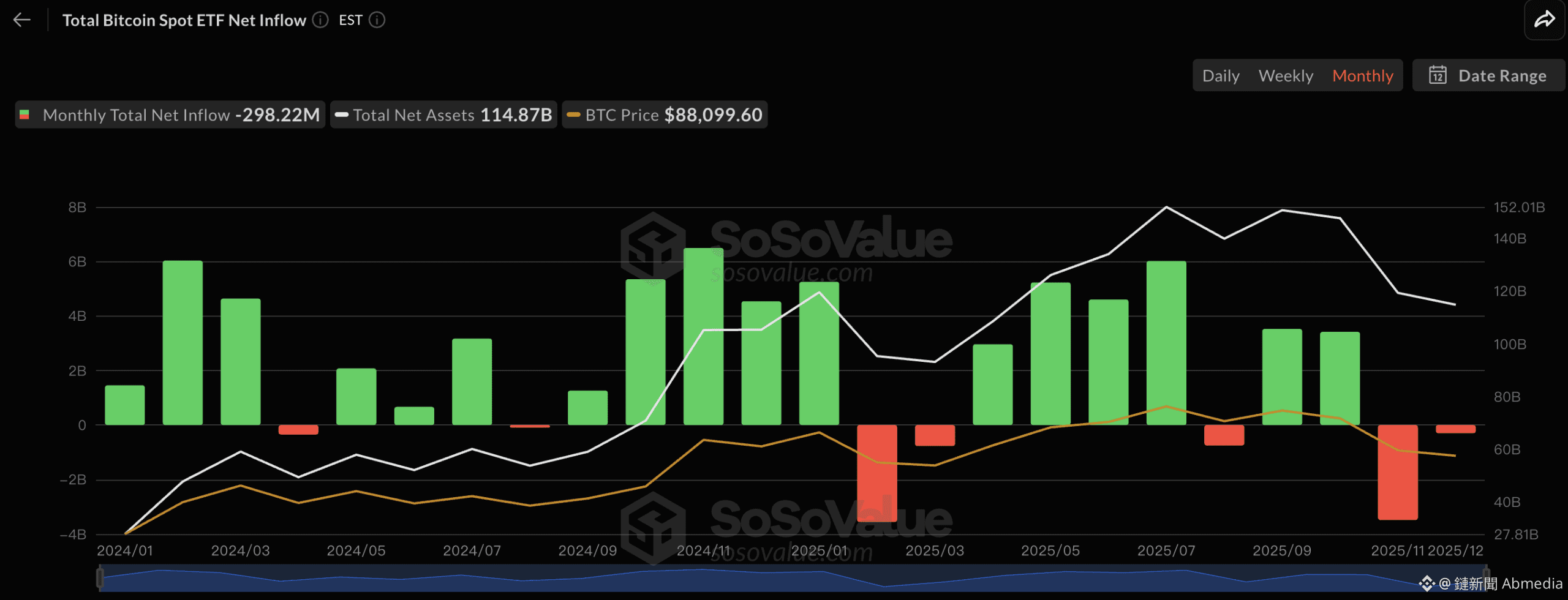 CryptoQuant 數據顯示,美國比特幣現貨 ETF 在 2025 年第四季總計減持約 2.4 萬枚 BTC (約 21 億美元),終止過去一年持續的吸納趨勢。