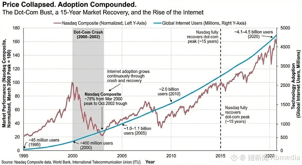 2000 年網路泡沫崩盤後,Nasdaq 市場與全球網路使用者數量的長期走勢 比特幣 ≠ 山寨幣 ≠ 加密市場