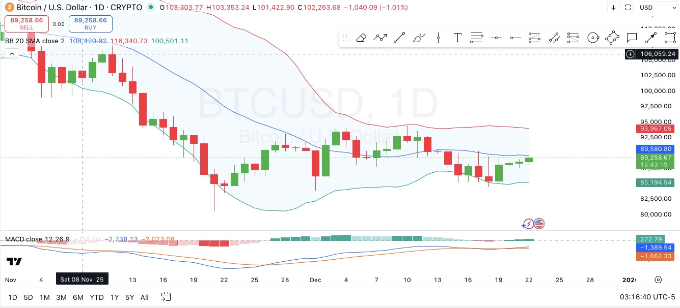 這意味著比特幣處於整合階段,可能會突破上行帶(約$94,000)或回撤到下行帶(約$85,000),這兩者都是重要的支撐和阻力水平。價格行為顯示,比特幣正在測試接近$89,000的支撐區域,20日簡單移動平均線與之對齊,這可能在面對賣壓時提供短期支撐。