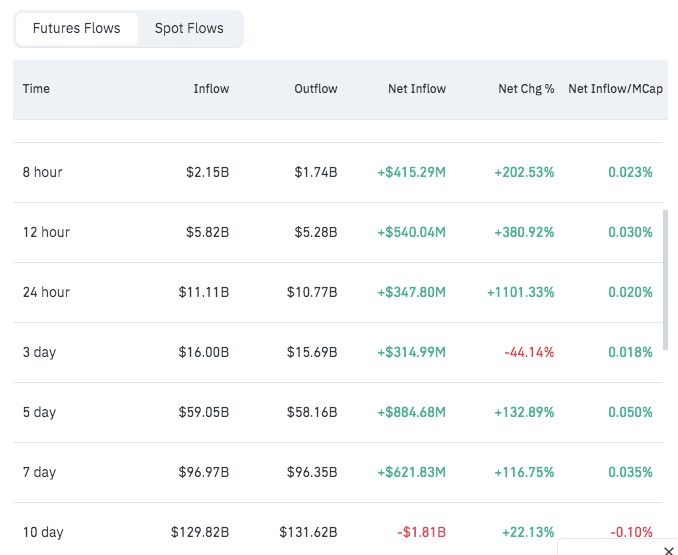 此外,期貨數據顯示資本流入比特幣的強勁,特別是在短期到中期,表明了牛市情緒。在過去的8小時和12小時內,比特幣分別看到了$415.29百萬和$540.04百萬的顯著淨流入,百分比增長達到202.53%和380.92%。