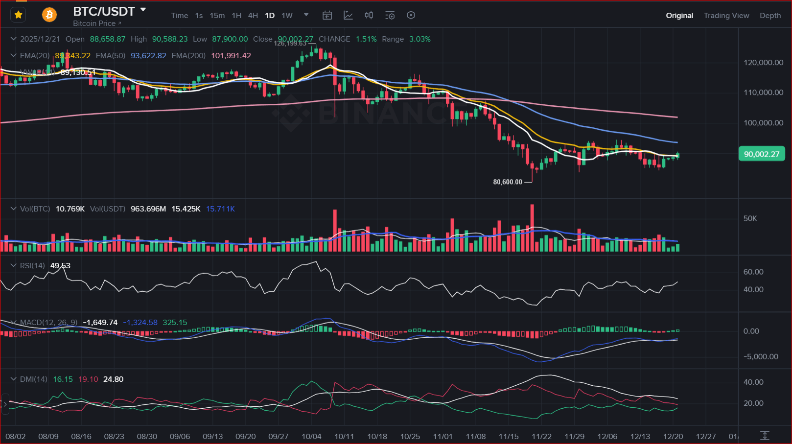 這是本週最重要的事情:價格($90,002)正試圖在每日EMA 20(黃色線)之上收盤,位於$89,343。