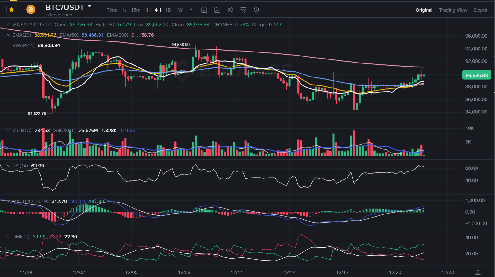 比特幣 ($89,936) 舒適地高於 50 日均線 ($88,486) 和 VWAP ($88,903)。