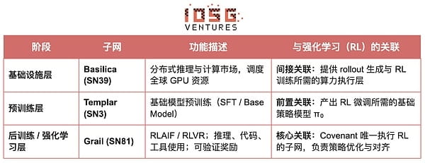 Bittensor 生態中的 Covenant AI 則通過 SN3 Templar、SN39 Basilica 與 SN81 Grail 構建了從預訓練到 RL 後訓練的垂直一體化流水線。其中,SN3 Templar 負責基礎模型的預訓練,SN39 Basilica 提供分佈式算力市場,SN81 Grail 則作爲面向 RL 後訓練的「可驗證推理層」,承載 RLHF / RLAIF 的核心流程,完成從基礎模型到對齊策略的閉環優化。