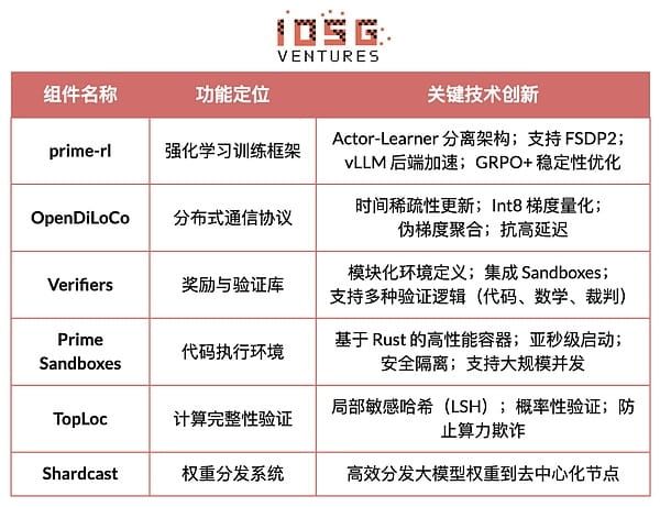 Prime Intellect 核心基礎設施組件 prime-rl 框架專爲異步分佈式環境設計與強化學習高度相關,其餘包括突破帶寬瓶頸的 OpenDiLoCo 通信協議、保障計算完整性的 TopLoc 驗證機制等。