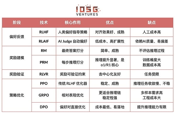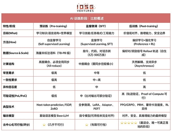 後訓練(Post-training)由多個迭代子階段構成,決定模型的推理能力、價值觀與安全邊界,其方法既包括強化學習體系(RLHF、RLAIF、GRPO)也包括無 RL 的偏好優化方法(DPO),以及過程獎勵模型(PRM)等。該階段數據量與成本較低(5–10%),主要集中在 Rollout 與策略更新;其天然支持異步與分佈式執行,節點無需持有完整權重,結合可驗證計算與鏈上激勵可形成開放的去中心化訓練網絡,是最適配 Web3 的訓練環節。