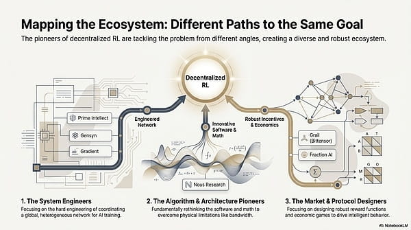 去中心化推訓網絡:從算力礦機到策略網絡,將並行且可驗證的 Rollout 外包給全球長尾 GPU,短期聚焦可驗證推理市場,中期演化爲按任務聚類的強化學習子網;