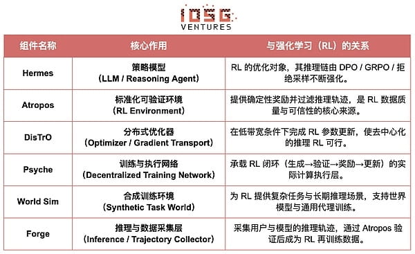 在 Nous 的體系中, Atropos 驗證思維鏈;DisTrO 壓縮訓練通信;Psyche 運行 RL 循環;World Sim 提供複雜環境;Forge 採集真實推理;Hermes 將所有學習寫入權重。強化學習不僅是一個訓練階段,而是 Nous 架構中 連接數據、環境、模型與基礎設施的核心協議,讓 Hermes成爲一個 能在開源算力網絡上持續自我改進的活體系統。