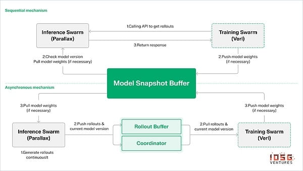 「推理—訓練解耦」天然契合去中心化的異構算力結構:Rollout 可外包給開放網絡,通過代幣機制按貢獻結算,而模型更新保持集中化以確保穩定性。