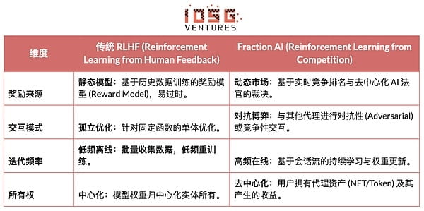 傳統 RLHF 與 Fraction AI 的 RLFC 之間的核心差異: