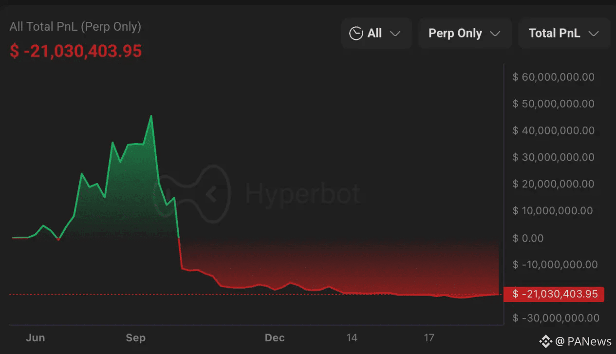 麻吉大哥仅在 11 月 1 日至 19 日这短短 19 天内,就被强制清算 71 次。 这意味着在接近三周的时间里,他平均每天要经历近 4 次爆仓,荣登链上「清算冠军」宝座,但他一直在不断地充值、爆仓、再充值、再爆仓。截至撰文,他在 Hyperliquid 上的永续合约总亏损已达到 2120 万美元。从赚 4566 万到亏 2120 万,他在短短不到 3 个月的时间里,经历了超过 6600 万美元的资产回撤。尽管有过短暂回血,但他目前依然处于深度亏损和频繁补保均金的状态中。